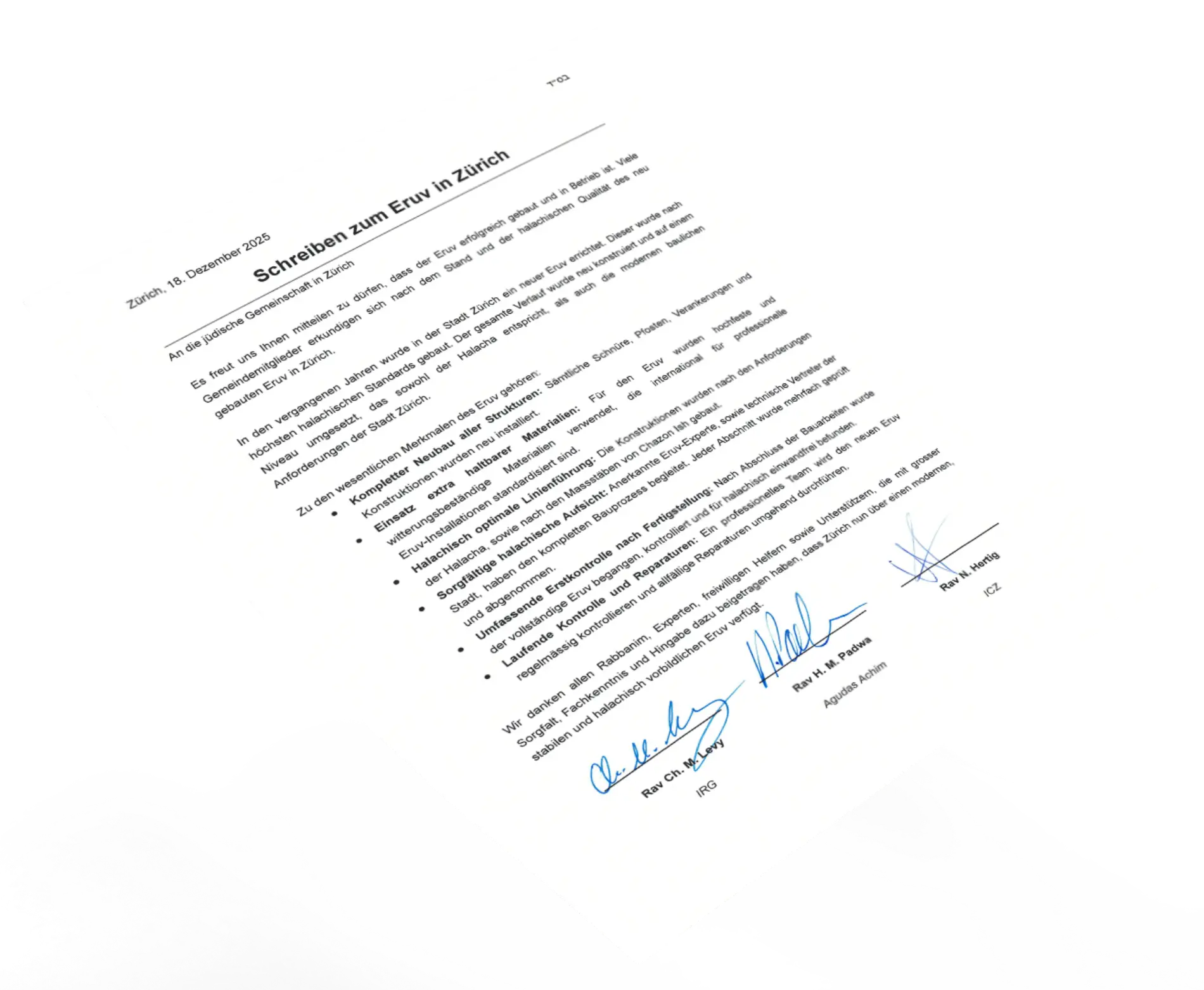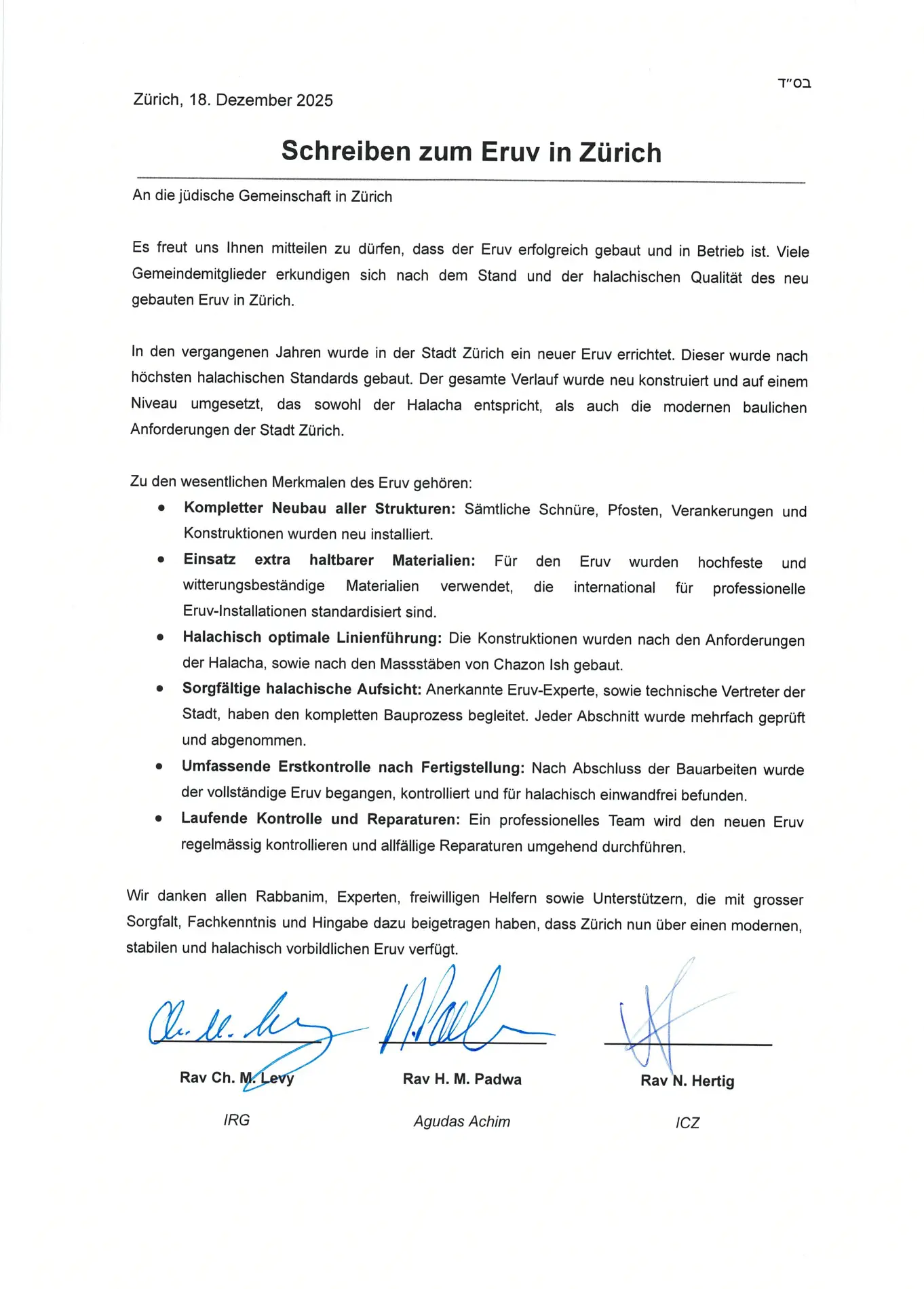 Der Eruv Zürich steht unter der gemeinsamen Verantwortung der Rabbiner der Agudas Achim, der Israelitischen Cultusgemeinde Zürich (ICZ) und der Israelitischen Religionsgesellschaft (IRG).
